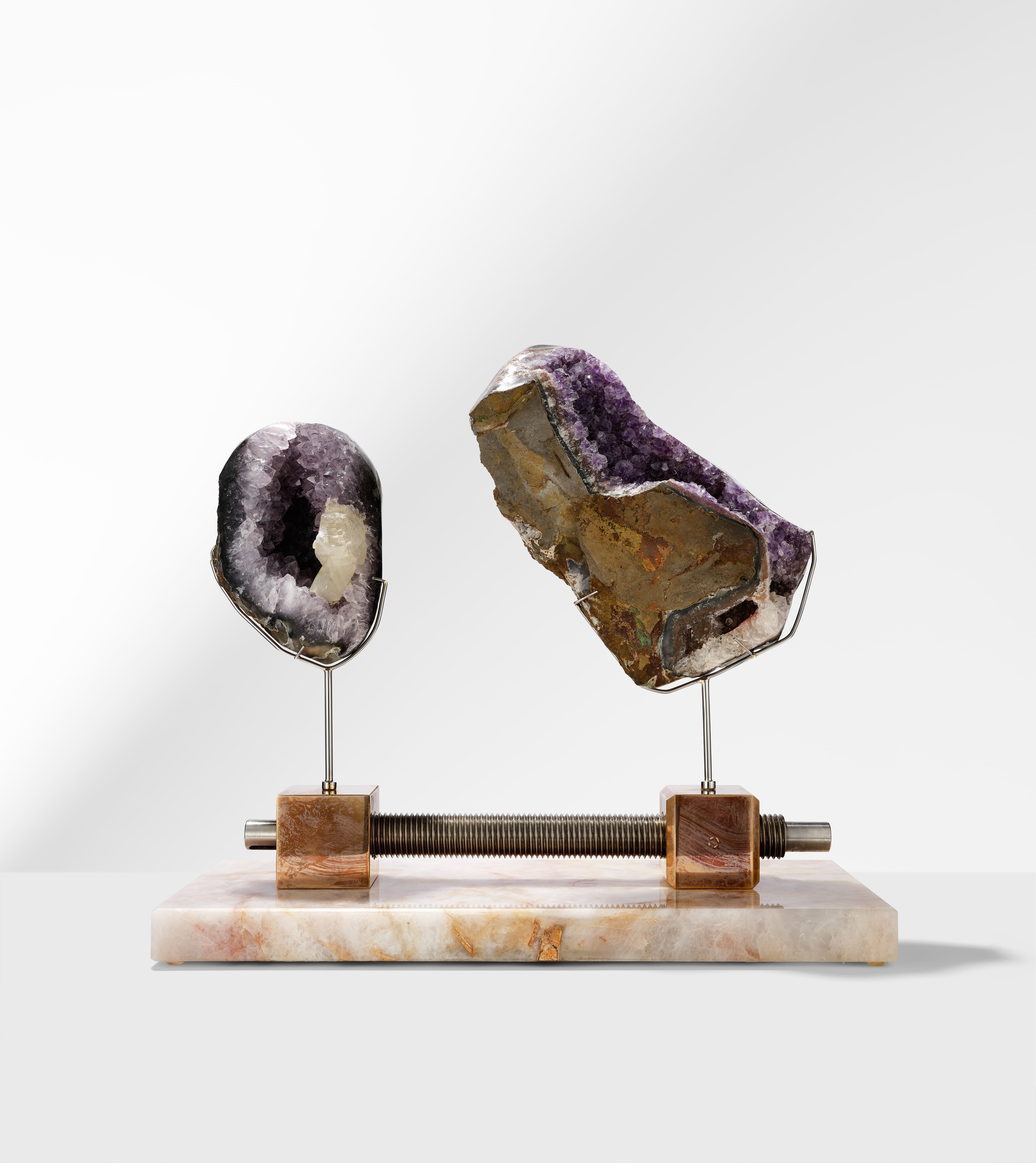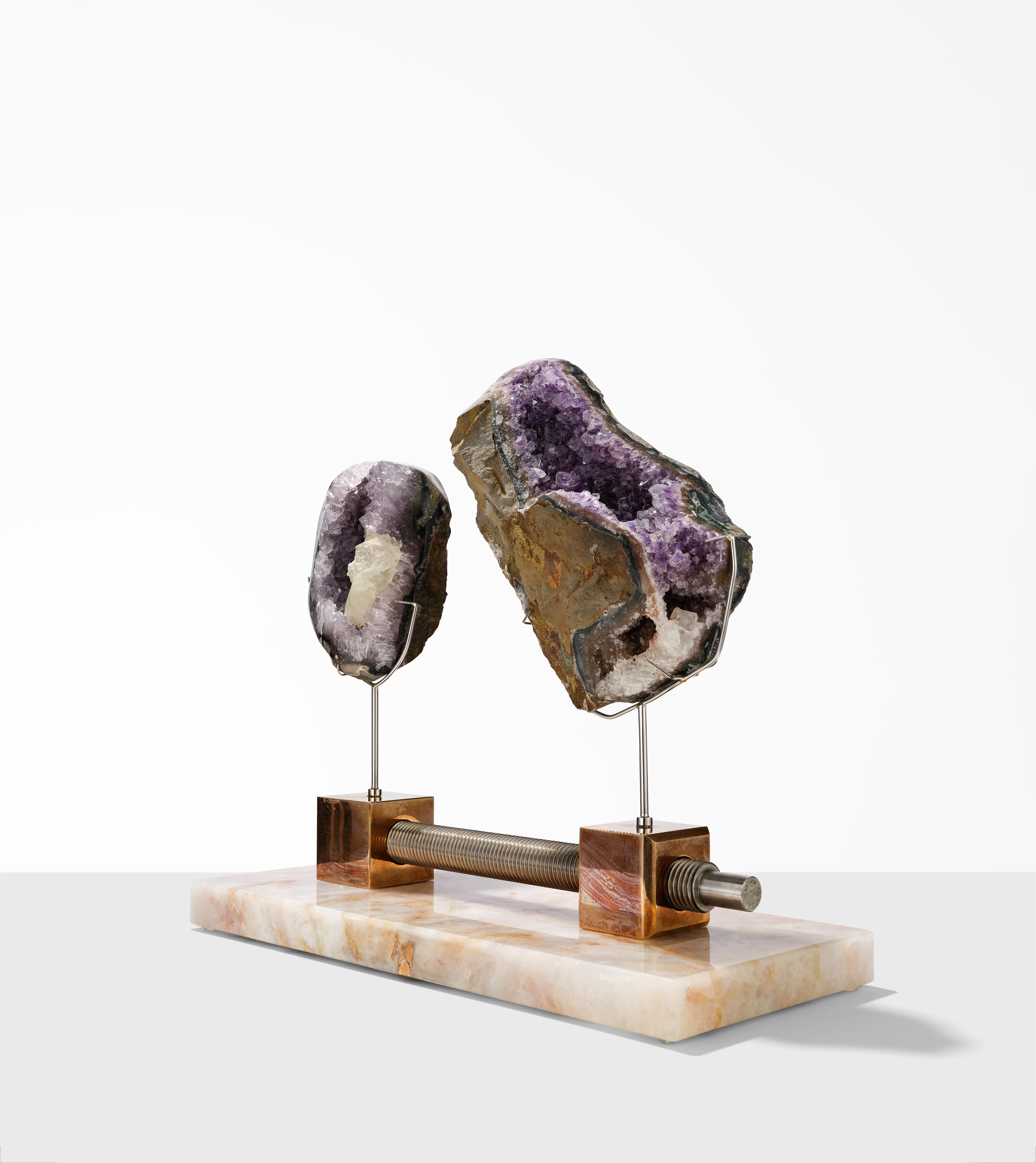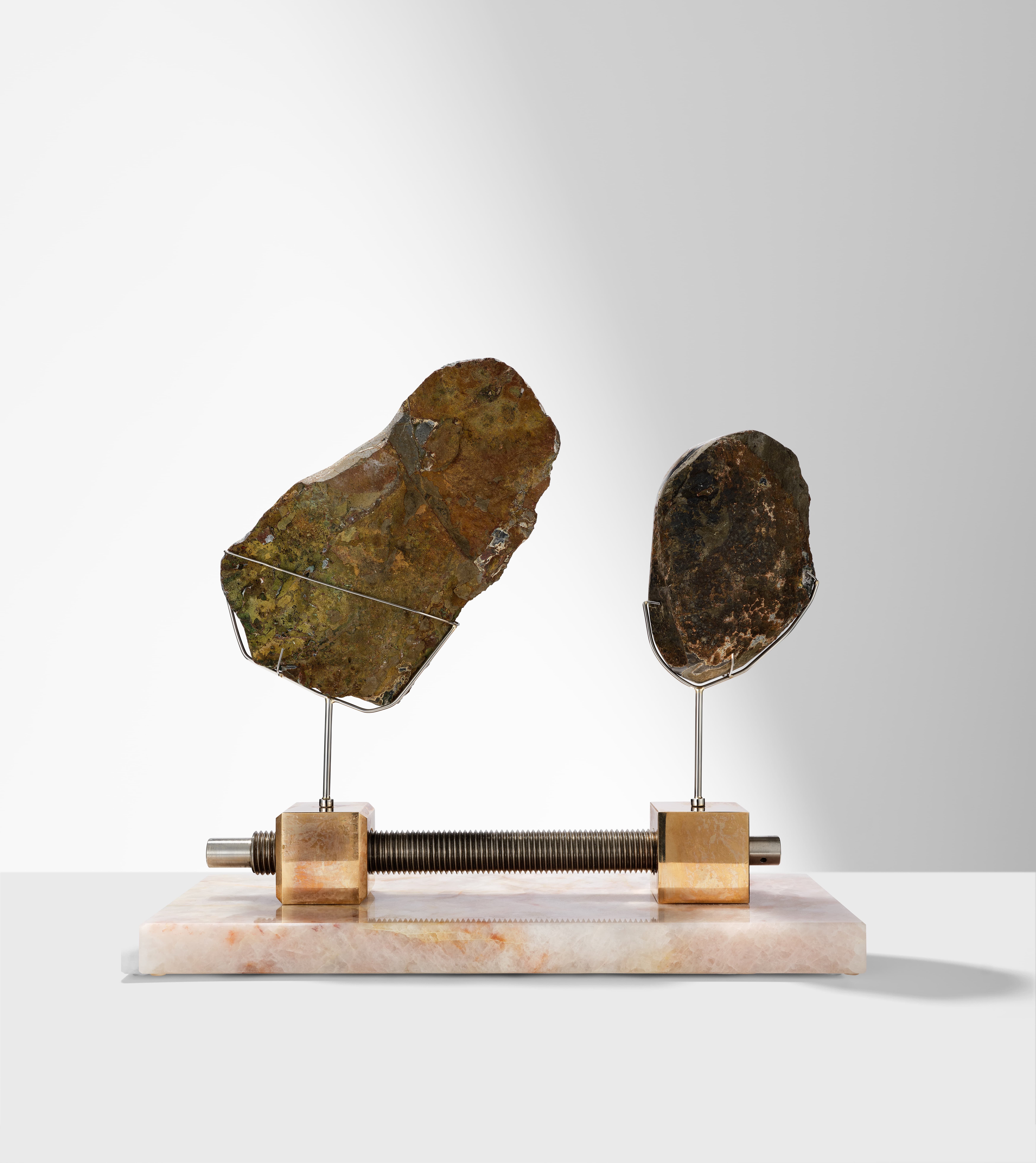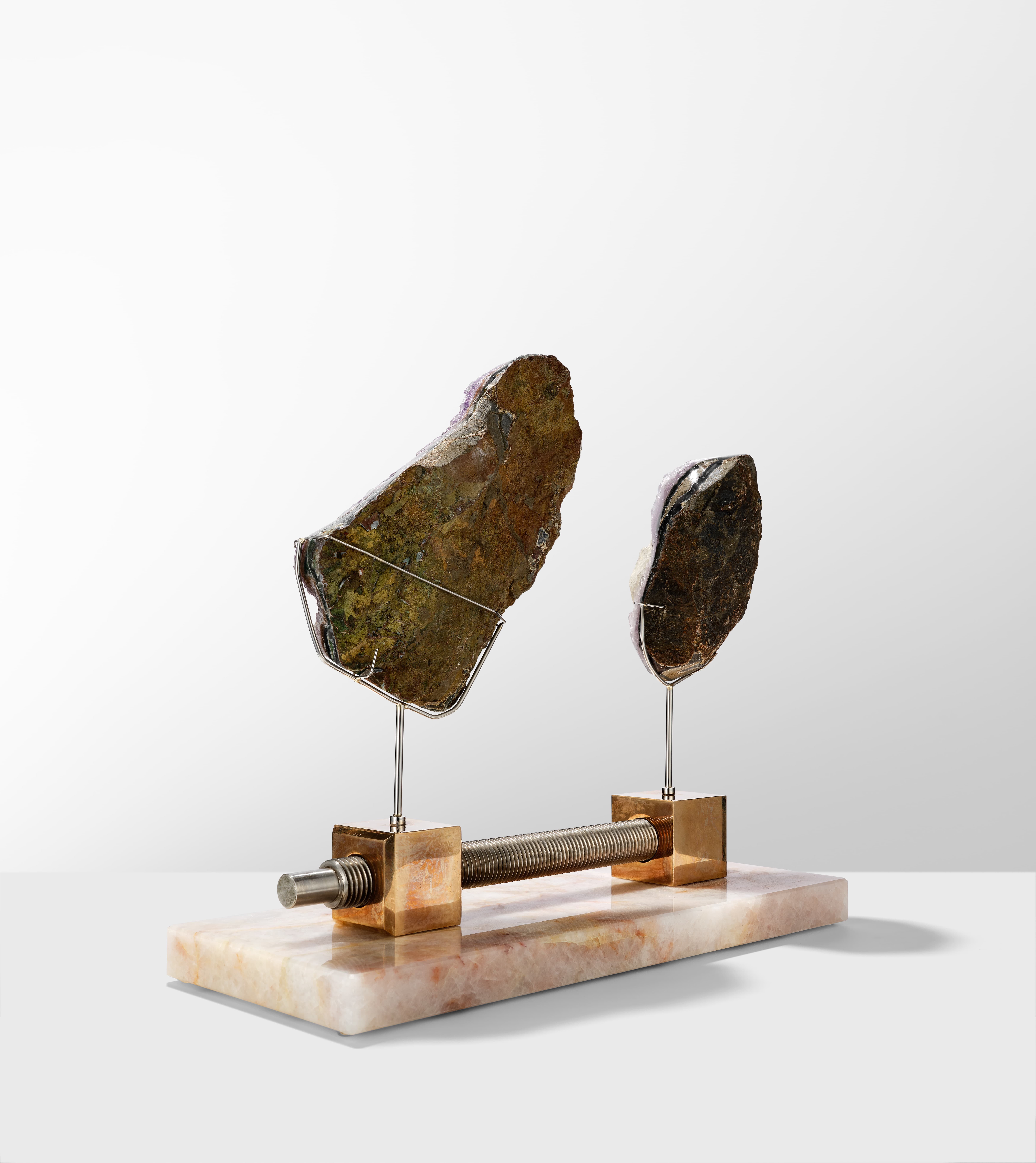 | Particular Consideration | Both specimens are resting in clasps and can be removed for closer inspection. Brass and stainless steel bar resting on Cristallo Juliette base and can be separated. Handle carefully to avoid damage. |